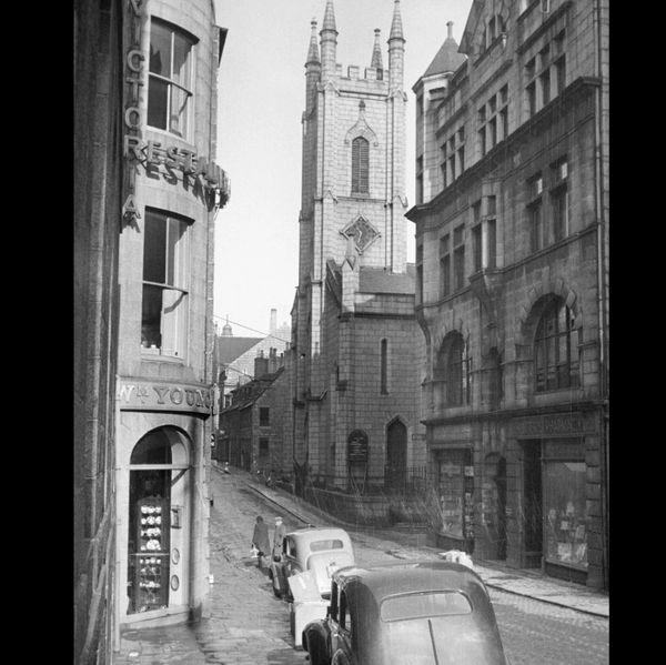 By the mid-20th century, the street shifted from a center of worship full of churches, to a center of culture. Slains sits at the crown of this historic thoroughfare, bridging the gap between the Victorian/Gothic elegance of the past and the vibrant, social energy of modern-day Aberdeen. This black-and-white photograph was taken in the mid-1900's (30s-40s).